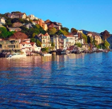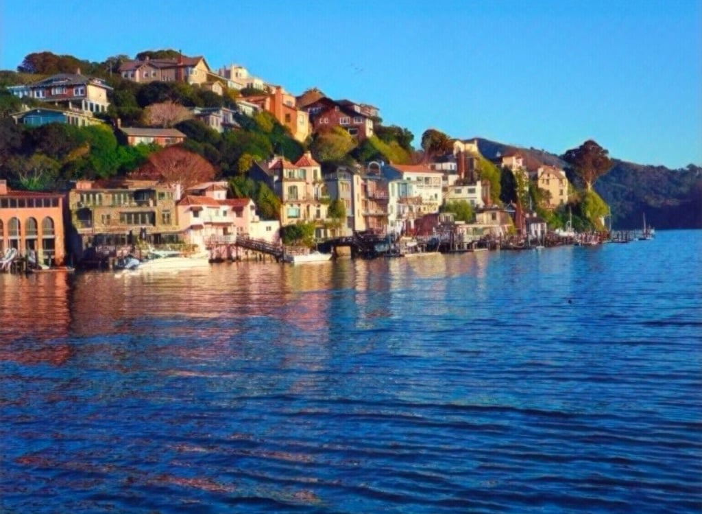 Captured along the waterfront, this original photograph holds a certain kind of light. Soft, reflective, almost surreal in the way it settles over the landscape. The homes, the water, the stillness—it all comes together in a way that feels both grounded and elevated at the same time.